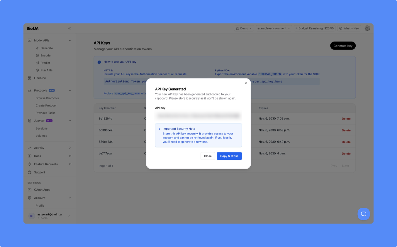 Your API key allows you to access BioLM programmatically through the HTTPS API or Python SDK.