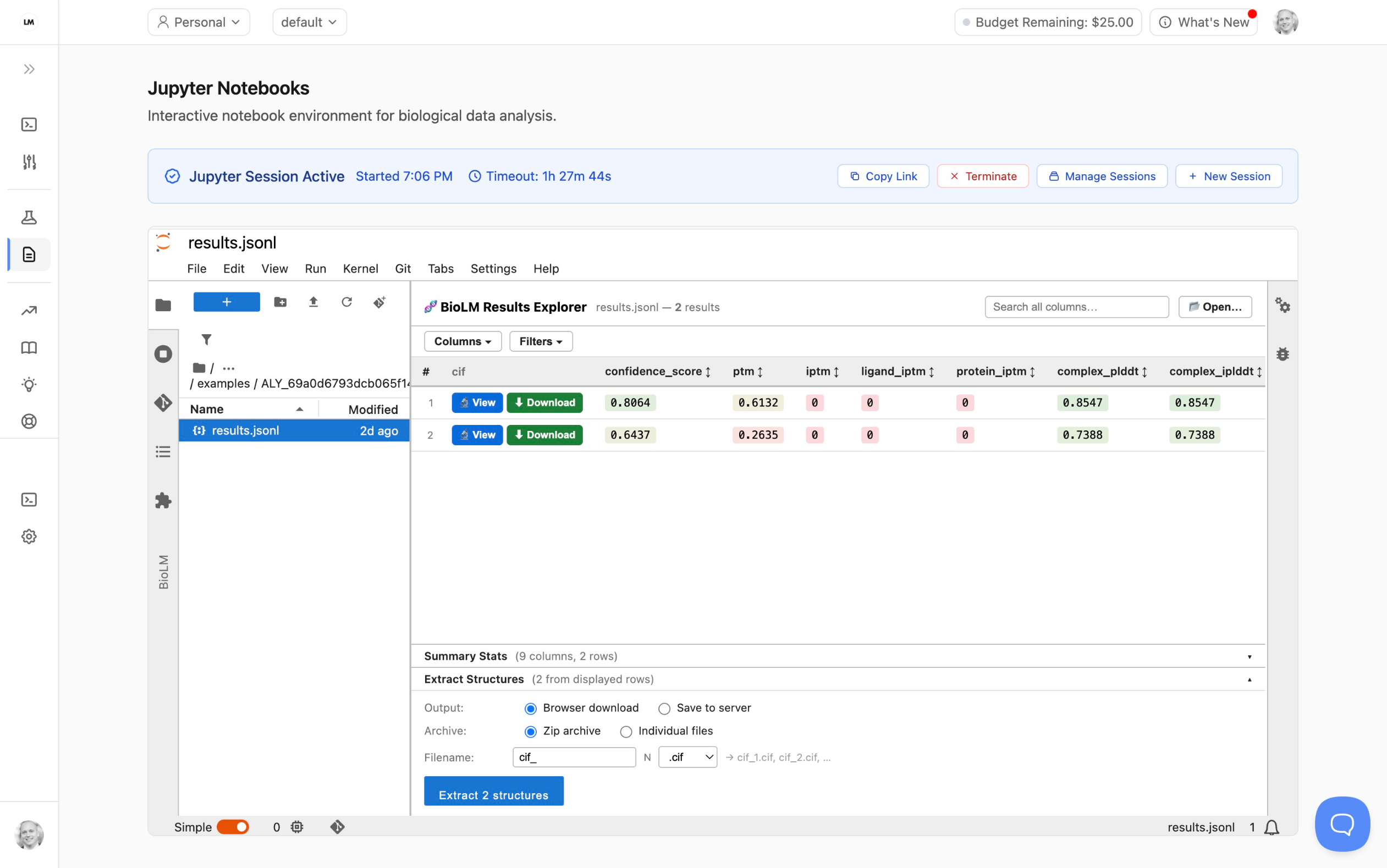 Once you are in the Jupyter Lab session, clicking on the results.jsonl (or .csv ) file can open the Results Explorer, where you can browse/sort/filter results, as well as extract/download individual results to structure files as well as perform bulk operations (like extracting all structure files to a zip file for download).